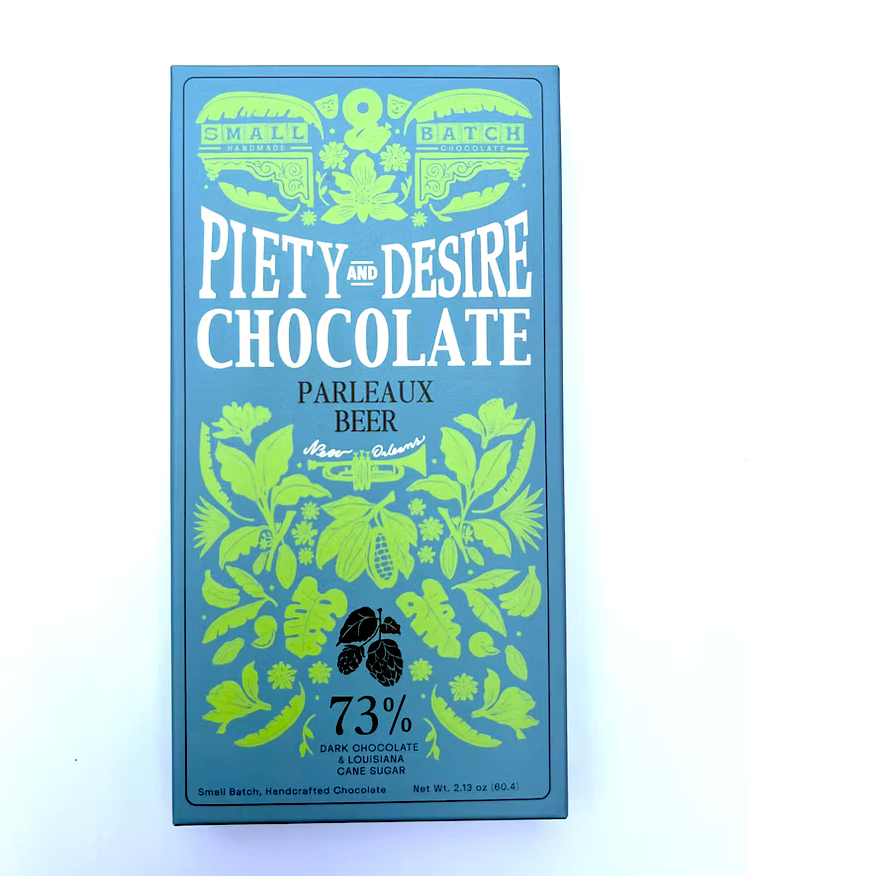 Our third selection came from Piety and Desire, a New Orleans-based chocolate maker whose name reflects the city’s cultural heritage. This innovative 73% dark chocolate bar features nibs soaked in stout beer from Parleaux Beer, along with hazelnuts and vanilla.